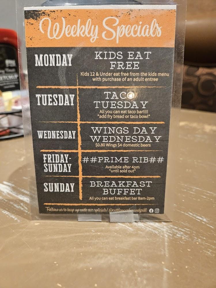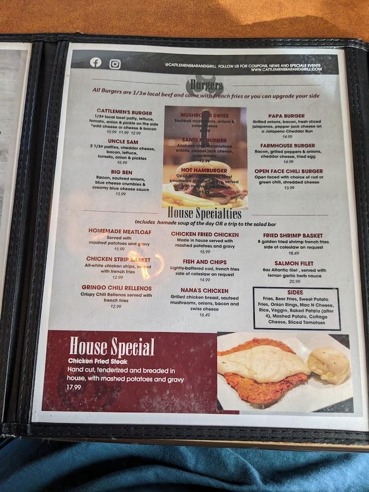 Cattlemen's menu highlights American classics, focusing on hearty meals. Breakfast offerings include Chicken Fried Steak, Smothered Breakfast Burritos, and various omelets. Lunch and dinner showcase burgers, sandwiches, and a selection of mouth-watering steaks. Vegetarians can find delicious options on the salad bar. Desserts like cheesecake and ice cream sundaes entice diners to save room after meals.